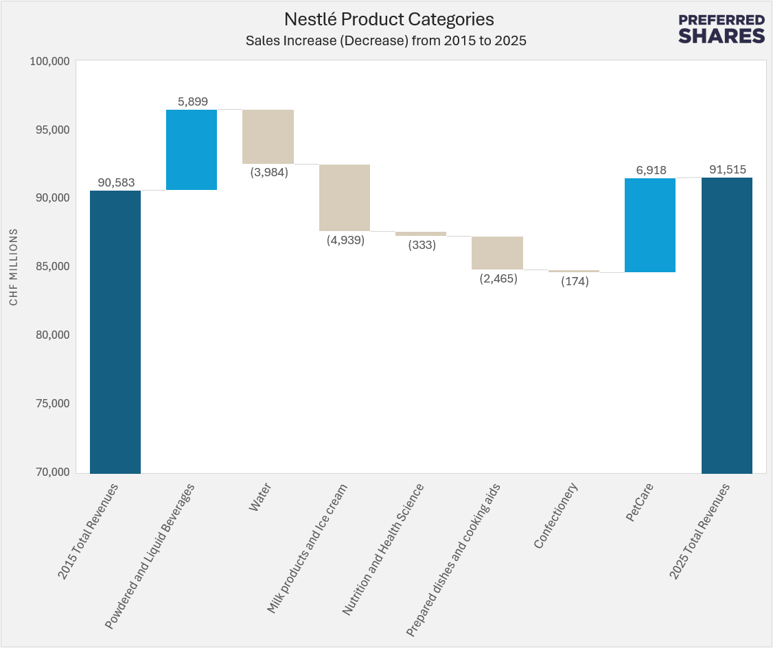 The two charts below show the total increase decrease of Nestlé’s seven product categories over the last ten years. The two growth categories have been Powdered and Liquid Beverages and PetCare, while the others have been down or flat. The result has been total sales not increasing by much for Nestlé over the prior decade.